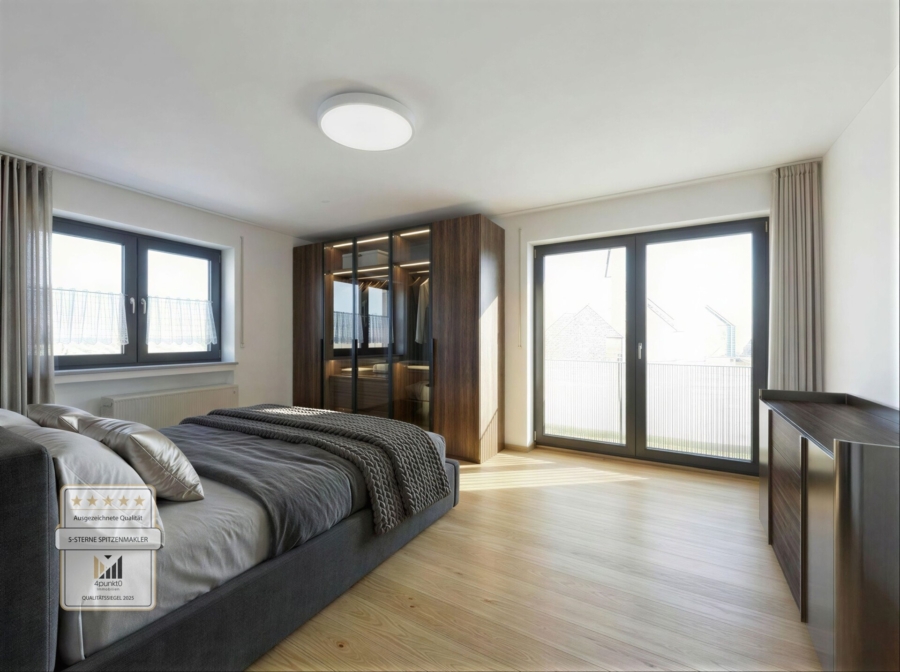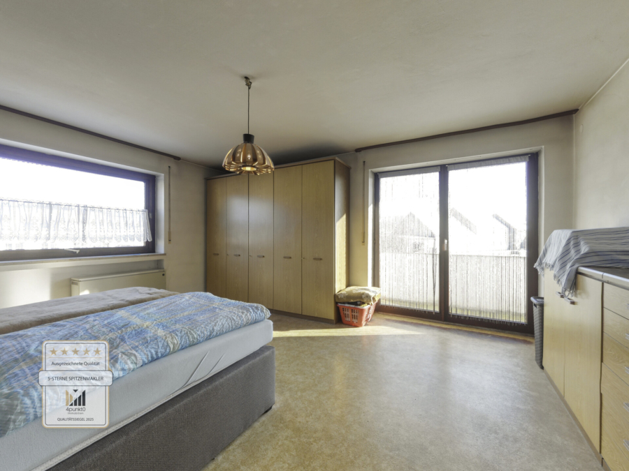 Drei Schlafzimmer im Obergeschoss, davon zwei mit Südsüdost Balkonzugang