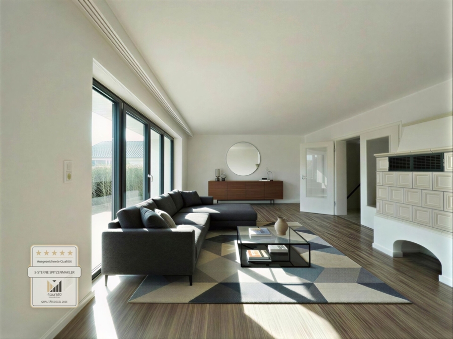 Im Erdgeschoss bildet die zentrale, großzügig geschnittene Diele mit Kachelofen den Mittelpunkt. Die Flure sind angenehm breit und vermitteln ein offenes Raumgefühl; die Raumhöhe liegt bei ca. 2,40 m. Von hier aus sind Wohnzimmer, Esszimmer, Küche sowie ein Gäste-WC direkt erreichbar. Das Wohnzimmer ist mit ca. 36 m² angenehm großzügig, auch mit Kachelöfen und direktem Zugang zur Südsüdost-Terrasse.