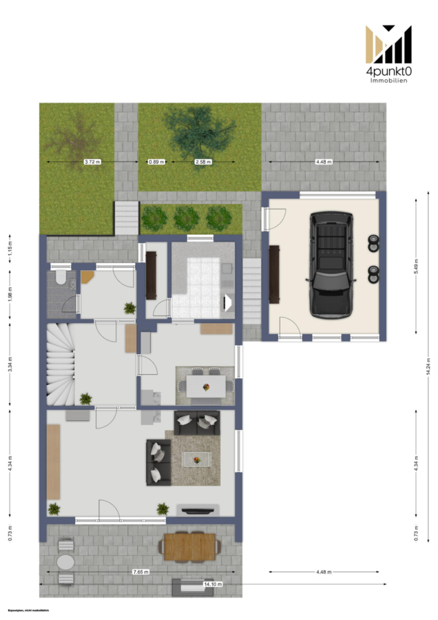 Auch außen stimmt das Gesamtpaket: Eine Doppelgarage mit zusätzlichen Stellplätzen davor. Der Garten ist vollständig eingezäunt, sonnig gelegen und verfügt über eine eigene Zufahrt. Zur besseren Vorstellung ist neben der Winteraufnahme auch eine Visualisierung der Außenbereiche enthalten.