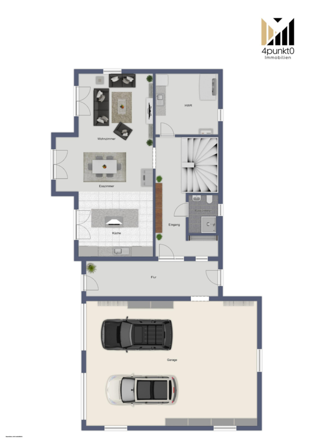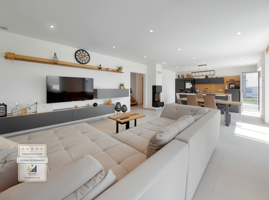 Erdgeschoss: Großzügiger Wohn-/Essbereich mit Kamin und offener Systemat-Küche (schwarzer Mattlack, Insel 240 × 120 cm, Induktionskochfeld mit integriertem Dunstabzug, Bosch Dampf-Backofen Serie 8, Bosch XXL-Geschirrspüler, Ritter Multischneider, Griffleistenbeleuchtung). Daneben Gäste-WC mit bodengleicher Dusche, Hauswirtschaftsraum mit Einbaumodulen, Arbeitsfläche, Oberschränken sowie integrierter Waschmaschine & Trockner. Über einen ca. 20 m² überdachten Verbinder ist die Garage (ca. 90 m²) direkt ans Haus angeschlossen.