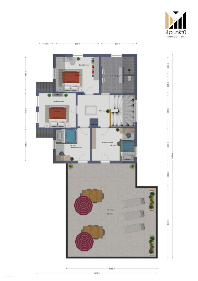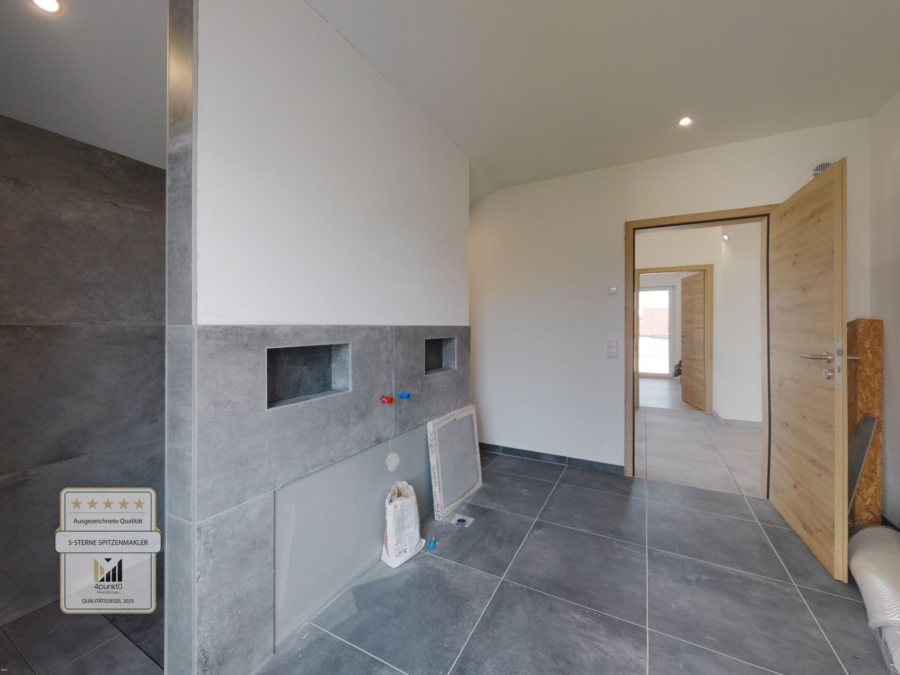 Im Obergeschoss befinden sich 4 Zimmer sowie ein vorbereitetes Bad, das noch nach eigenen Vorstellungen fertiggestellt werden muss. Zwei der Zimmer bieten direkten Zugang zu der rund 110 m² großen Dachterrasse über der Garage – eine seltene Freifläche mit viel Platz für Dachgarten, Lounge oder Spielbereich.
