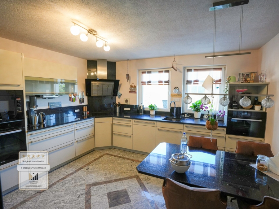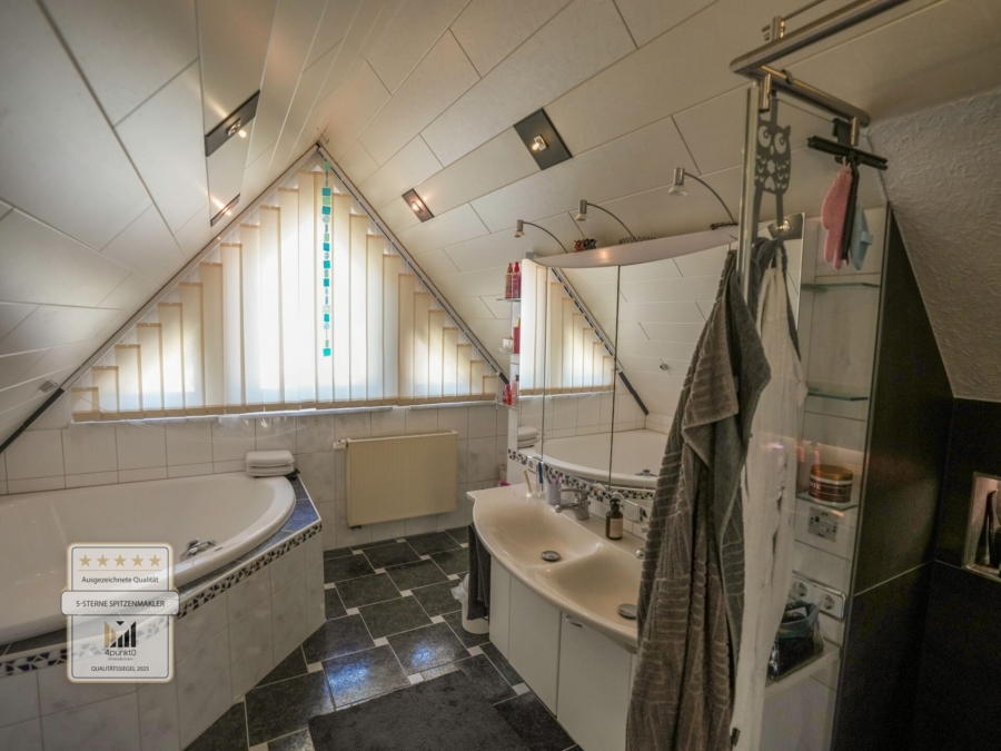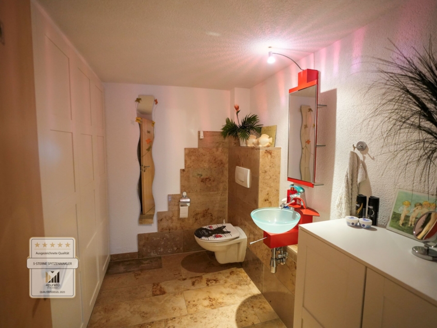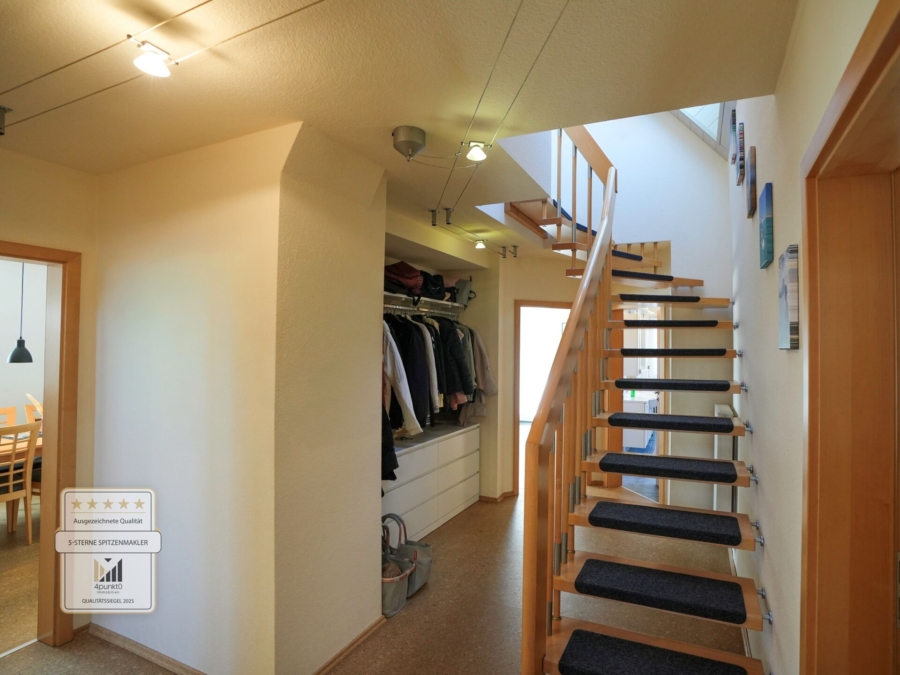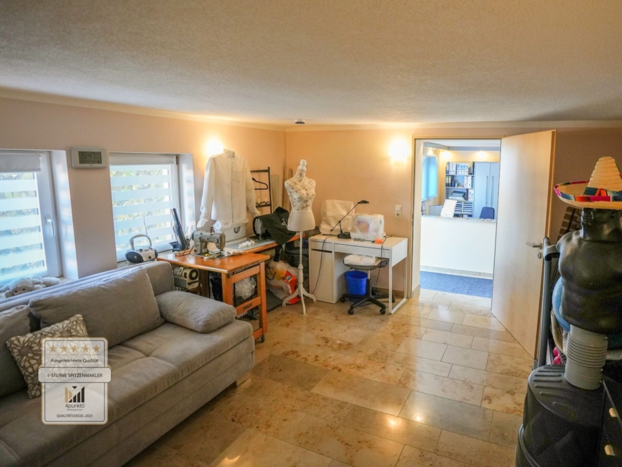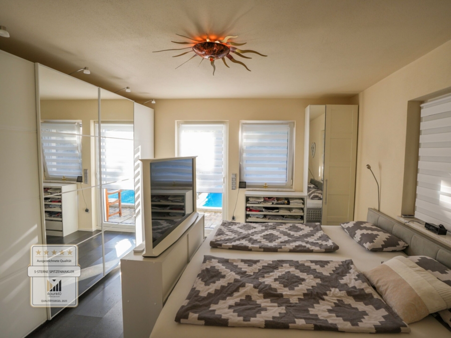 Zum Haus gehören ein überdachter Süd-Freisitz mit Glas-Schiebetüren, ein beheizter Pool mit Wärmepumpe und Solartechnik sowie das Gartenbad aus dem Jahr 2024. Auch die Aufteilung bietet Spielraum: OG und DG sind über den Westbalkon mit Außentreppe aus dem Jahr 2021 separat erreichbar. Dadurch lässt sich das Haus bei Bedarf in zwei Bereiche gliedern – zum Beispiel für Mehrgenerationenwohnen, eine Einlieger-Option oder einen klar getrennten Arbeitsbereich.