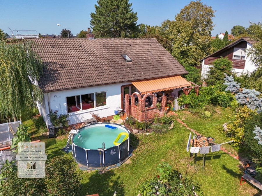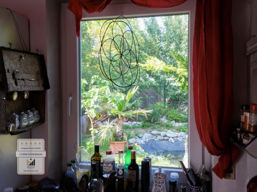 Der Garten bietet viel Privatsphäre und ist aktuell mit einem größeren Teich, einer Feuerstelle, zwei Gewächshäusern und umfangreichem Gemüseanbau ausgestattet. Die Terrasse ist großzügig, teilweise überdacht und mit einer Markise versehen.