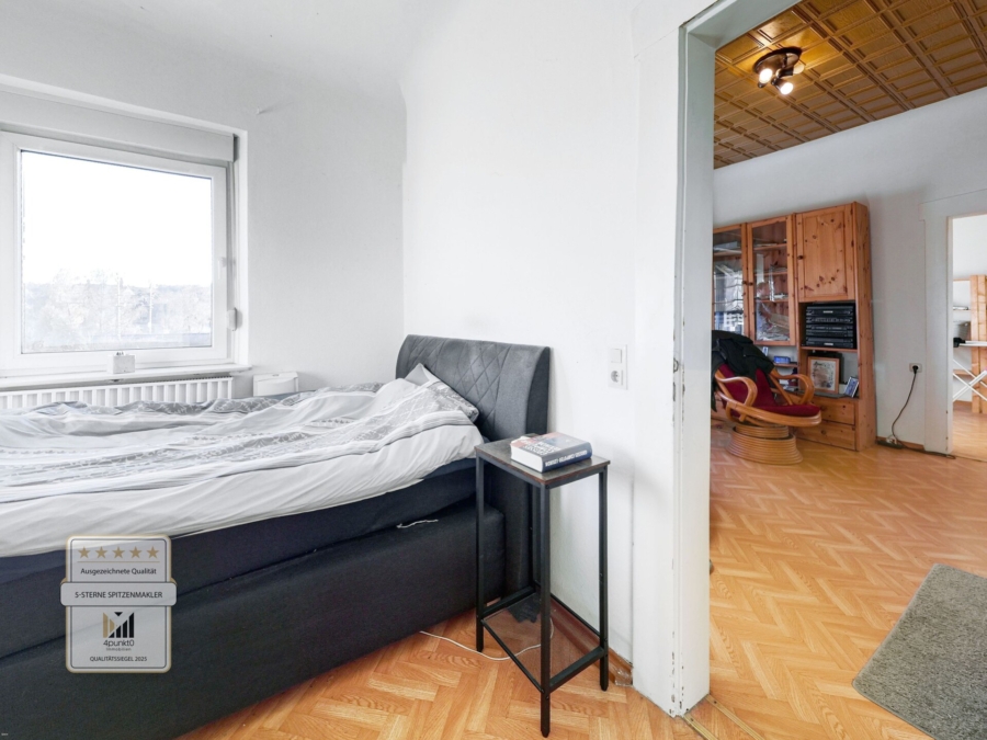 Mit rund 70 m² Wohnfläche bietet die Wohnung einen klaren Grundriss mit Wohnzimmer, Schlafzimmer, zwei weiteren Zimmern, Küche mit Balkonzugang, Tageslichtbad und Flur. Die Räume sind hell, freundlich und flexibel nutzbar – ob für Paare, kleine Familien oder zur Vermietung. Der Westbalkon öffnet den Blick über die Nachbarschaft und sorgt für Sonne bis in den Abend.