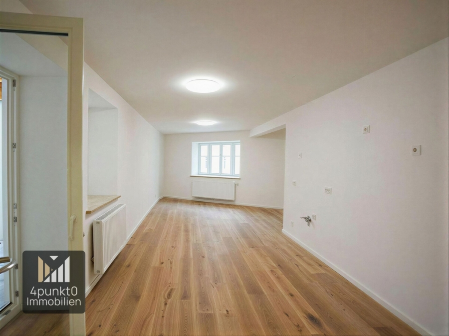 Der offen gestaltete Wohnbereich bietet viel Platz für Wohnen, Essen und Küche. Die Wohnung wird ohne Einbauküche vermietet – Anschlüsse und Stellflächen sind vorhanden, sodass der Küchenbereich individuell gestaltet werden kann.